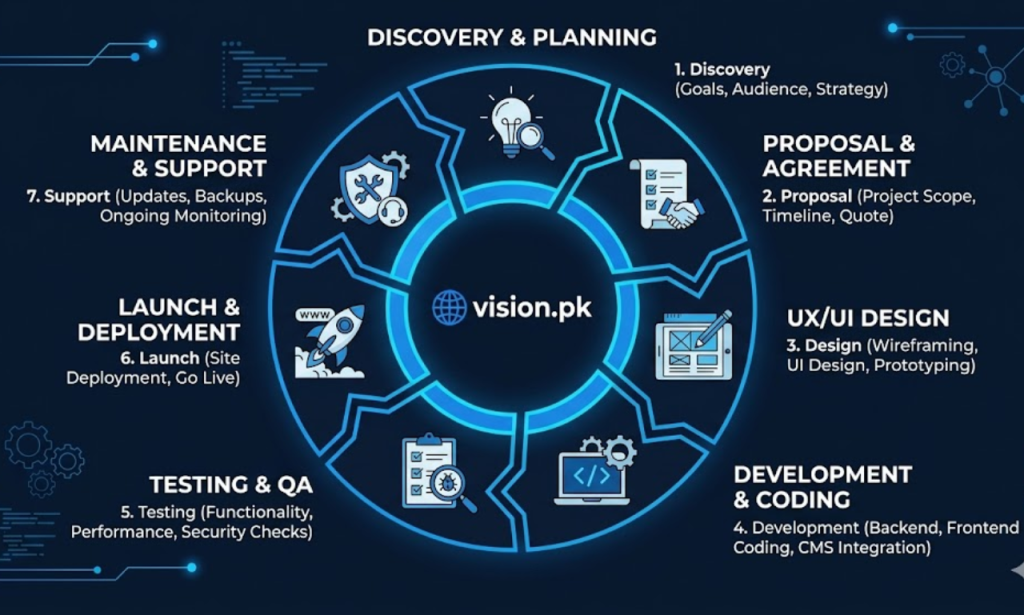 Step 1 — Discovery Call You share your business, your goals, your audience, and your budget. vision.pk asks smart questions. They listen more than they talk. This is where great web projects start.