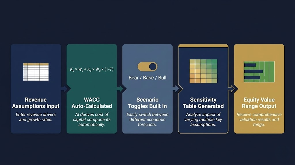 | DCF Builder | Three-statement model + WACC + scenarios + sensitivity tables |