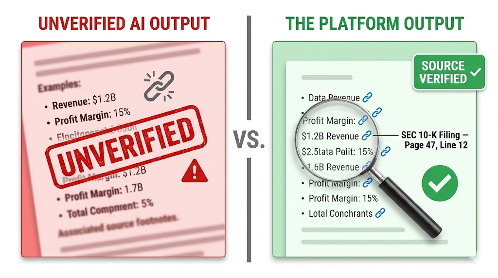 Every piece of data in a a platform output output comes with a hyperlink to its exact source — a specific cell in a spreadsheet, a specific page in an SEC filing, a specific data point in a Bloomberg pull. You can verify in seconds, not hours.